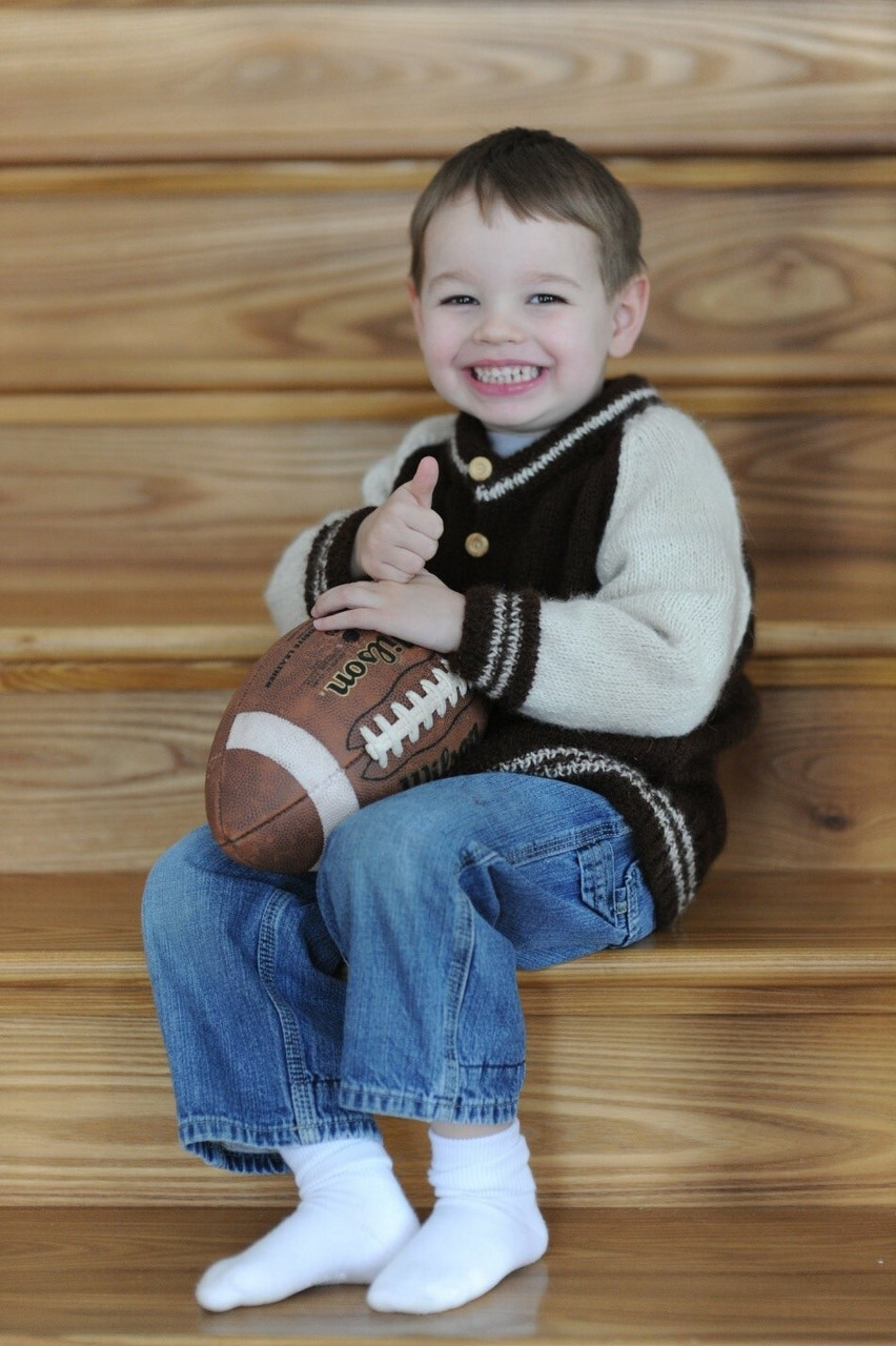 Remember your high school letter jacket? Re-created in our alpaca yarns for your little one.